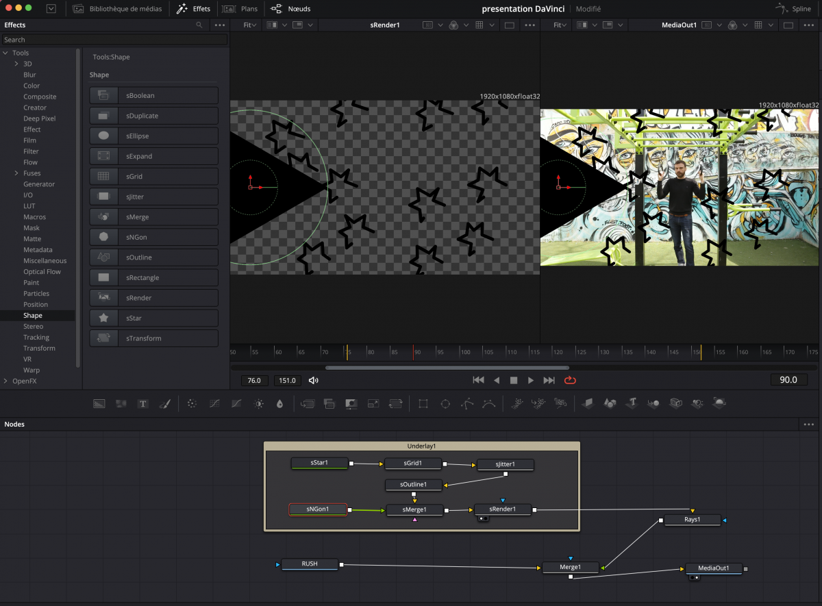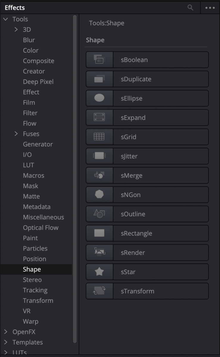 On remarque la même tendance d’ouverture au Motion Design à propos des Nodes S., ceci depuis la version 17. Il s’agit de l’univers des formes vectorielles. Les outils d’éléments de formes n’étaient pas forcément présents ou simples à manipuler dans Fusion. C’est pour cela que les récentes mises à jour ont ajouté les nodes de forme, avec une nouvelle catégorie d’outils comme il y avait déjà des outils pour travailler en 3D et dans les particules.