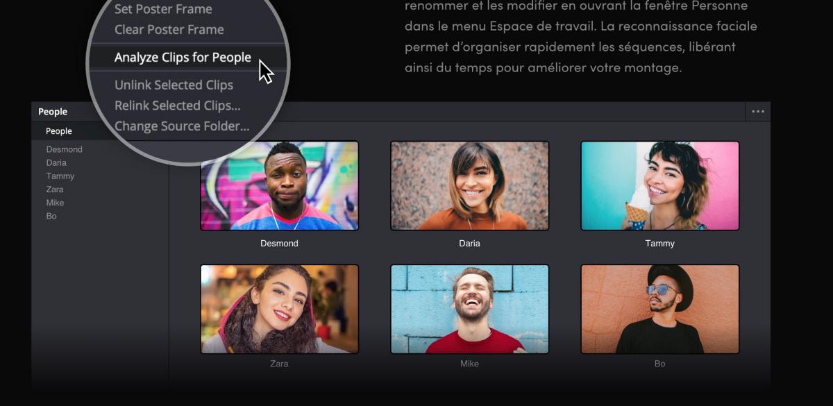 BlackMagic met l’accent sur la puissance de la mise à jour 17.4, notamment pour le décodage des fichiers BlackMagic Raw 12K, trois fois plus rapide, l’accélération matérielle de l’Apple ProRes sur les MacBook Pro équipés de puces M1 Pro et M1 Max, et l’encodage H265 1,5 fois plus rapide. Cela signifie donc que cela accélère globalement la lecture des fichiers complexes, que cela accélère l’encodage, et la prise en charge des formats Raw ou des formats compressés comme le H265. Sans oublier l’accélération de tous les outils d’intelligence artificielle, dont la reconnaissance faciale, qui crée des chutiers automatiques avec un classement par personnages.