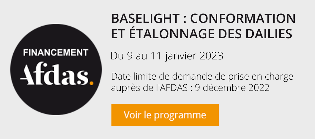 Le programme du module Baselight : conformation et étalonnage des dailiesqui se déroule sur trois jours est donc dédié à la conformation et à la partie étalonnage des Dailies sur Dailight. Il s’adresse aux assistants étalonneurs (Conform Assist’), aux assistants monteurs et étalonneurs de rushes.