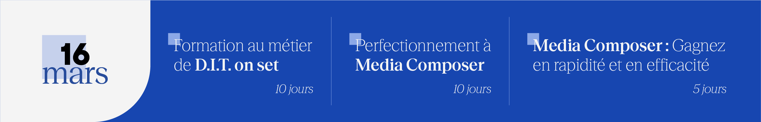 Ce stage de 5 jours s’adresse aux personnes ayant déjà une expérience sur d’anciennes versions du logiciel. Il apprend à utiliser les fonctionnalités de montage de Media Composer sur sa dernière version, ses différents outils audios et ses effets, depuis l’import des rushes jusqu’à la gestion des médias pour les sorties. Le stage introduit également au compositing 2D et 3D et aux outils d’étalonnage.