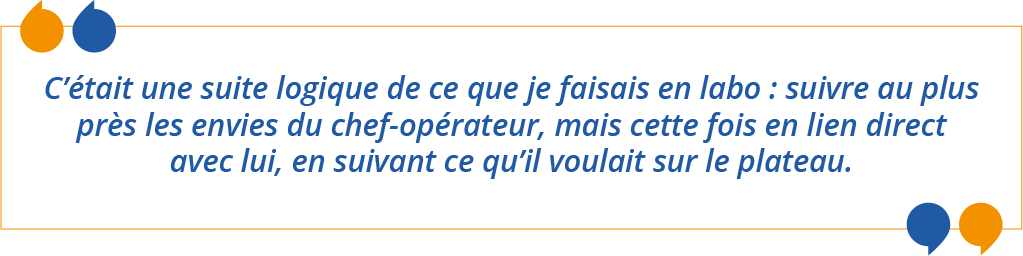 C’était une suite logique de ce que je faisais en labo : suivre au plus près les envies du chef-opérateur, mais cette fois en lien direct avec lui, en suivant ce qu’il voulait sur le plateau.