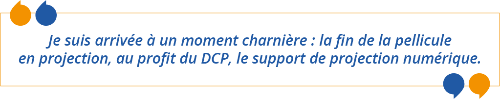 Je suis arrivée à un moment charnière : la fin de la pellicule en projection, au profit du DCP, le support de projection numérique. J’ai assisté, petit à petit, à l’arrivée des tournages en caméras numériques et à la réduction des tournages en 35 mm. Au début, je faisais encore pas mal de scan de rushes de bobines, du kinescopage pour la conservation de film, de l’encodage DCP et de la vérification de copie master.